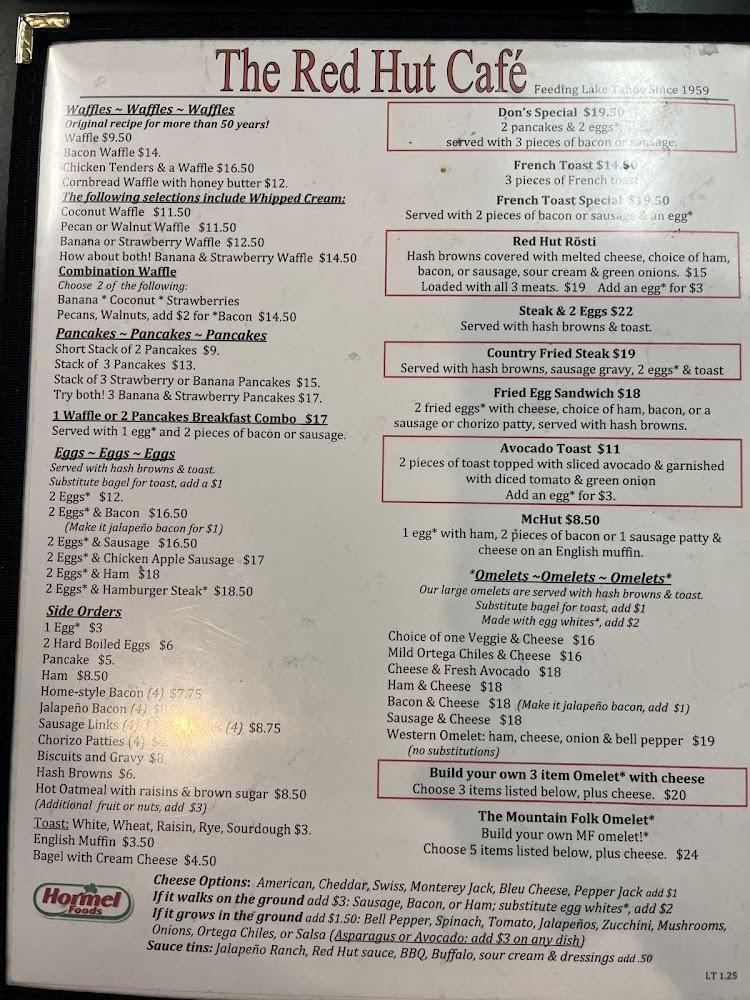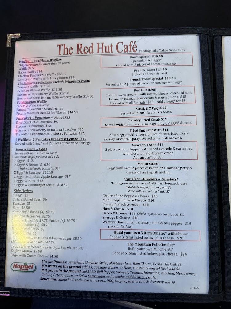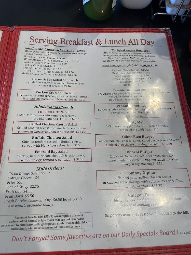 Welcome to The Red Hut Cafe, your go-to dining destination in Stateline, NV, where we celebrate the flavors of American cuisine with a local twist. Nestled at 229 Kingsbury Grade Rd, our cozy cafe is perfect for breakfast, brunch, and dinner, offering a delightful menu featuring fresh ingredients and homemade specialties. Enjoy quick service in a relaxed atmosphere, ideal for families and solo diners alike. With accessible seating and parking, we welcome everyone to savor our exceptional coffee and traditional dishes. Join us for a memorable meal, whether you dine in or take out!